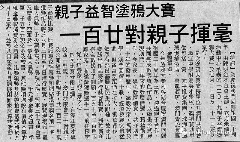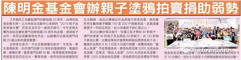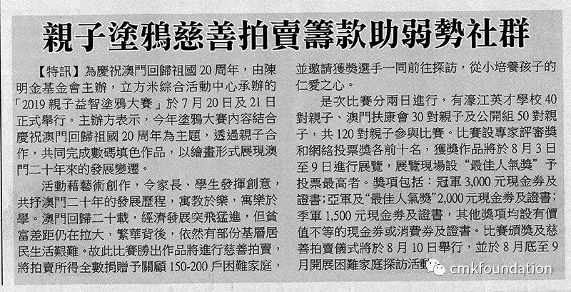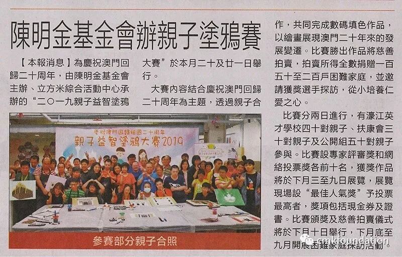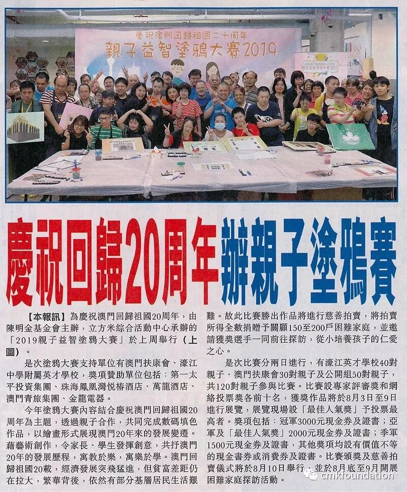 為慶祝澳門回歸祖國20周年,由陳明金基金會主辦,立方米綜合活動中心承辦的「2019親子益智塗鴉大賽」於7月20日及21日正式舉行。